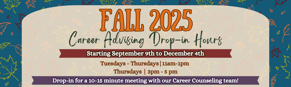 Drop-In types include: Major/Career Exploration, Resume/Cover Letter Review, Mock Interviews, Job/Internship Search and more!