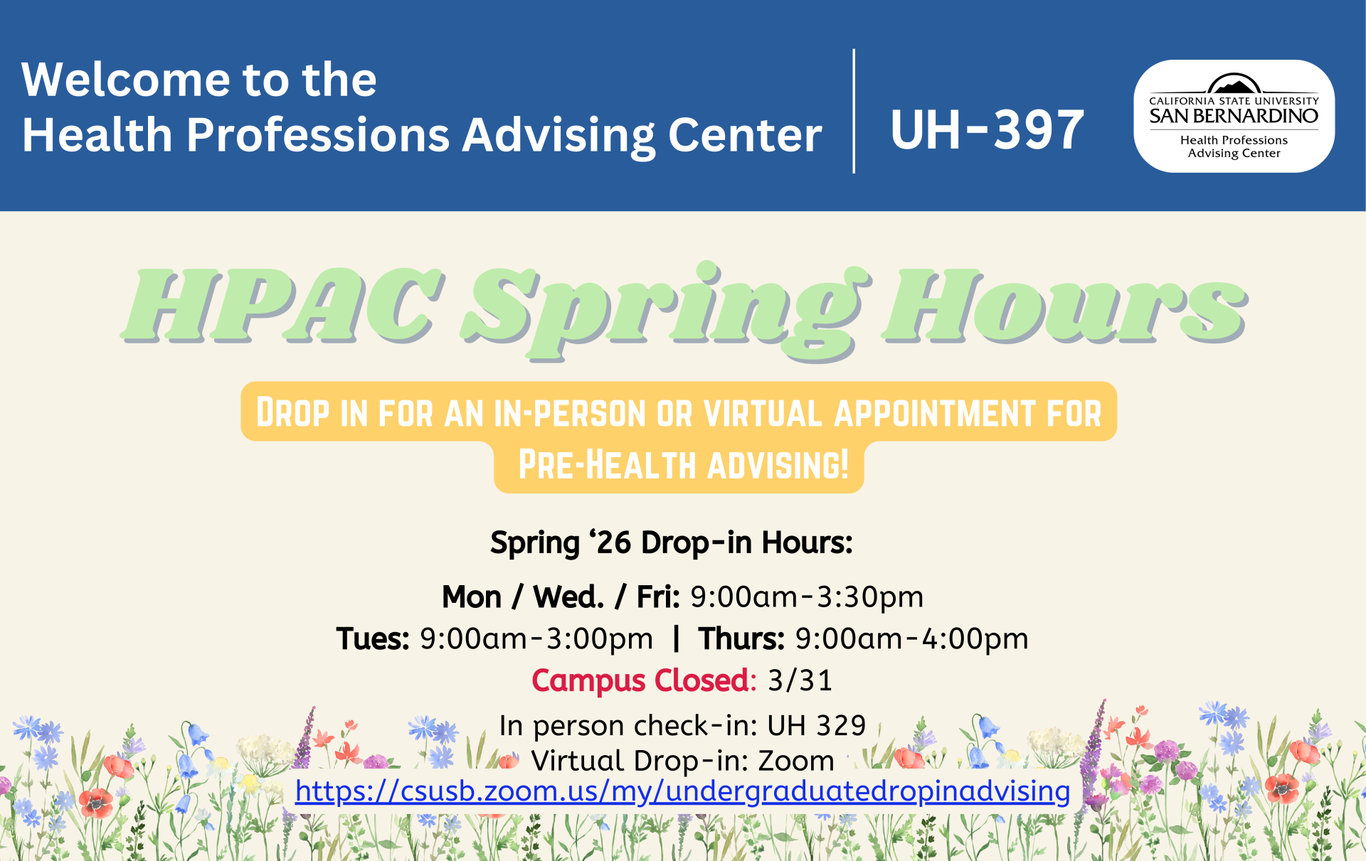 The Health Professions Advising Center (HPAC) provides current CSUSB students and alumni strengths-based advising, resources, and support for those seeking careers in the health professions. HPAC is staffed with a dedicated professional and pre-health peer advisors committed to supporting CSUSB’s diverse study body in attaining their academic and professional goals.
