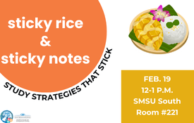 Join us for Sticky Rice, Sticky Notes: Strategies That Stick, a hands-on session covering study tips and techniques for different majors and types of course content. Learn about useful academic tools, explore on-campus resources, and enjoy mango sticky rice while picking up strategies that actually stick!
