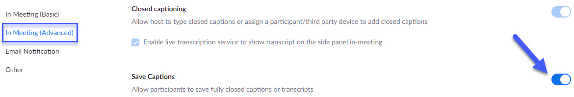 To allow the ability to save the transcript, ensure that the "Save Captions" option has been enabled in your Zoom account.