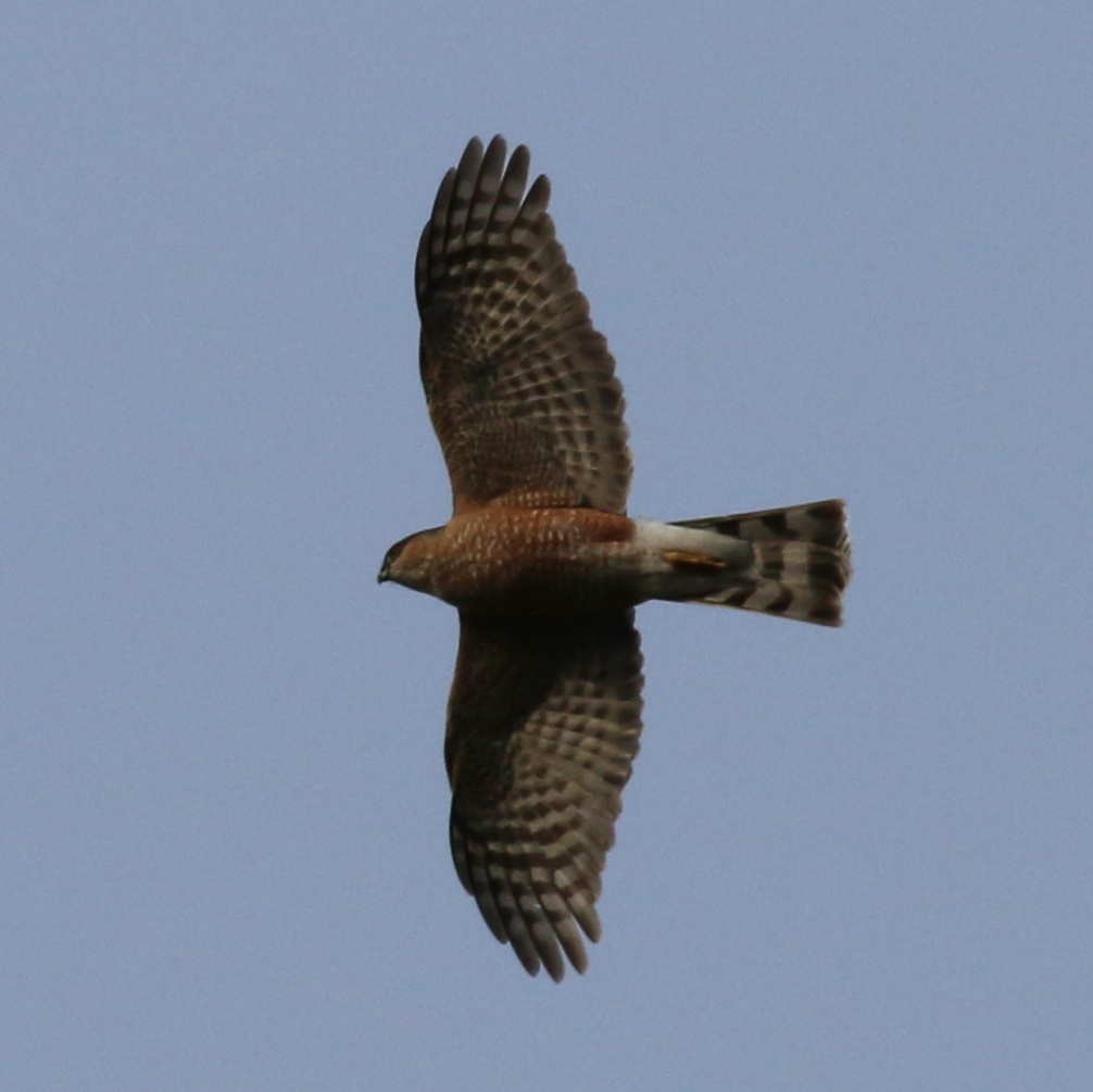 The Sharp-shinned Hawk is a casual visitor to campus with about ten sightings of migrants in March-April and October-November. The Sharp-shinned Hawk is a fairly common migrant and winter visitor in southern California.The adult Sharp-shinned Hawk can be identified by its slaty blue upperparts and crown, reddish orange underparts, white rump and undertail coverts, long, banded tail, and orange-red eye. Juveniles have mostly brown upperparts, white underparts with brown streaking, and a yellow eye. It can be difficult to distinguish from the similar-looking Cooper's Hawk, but is smaller and has a shorter, more squared tail.
