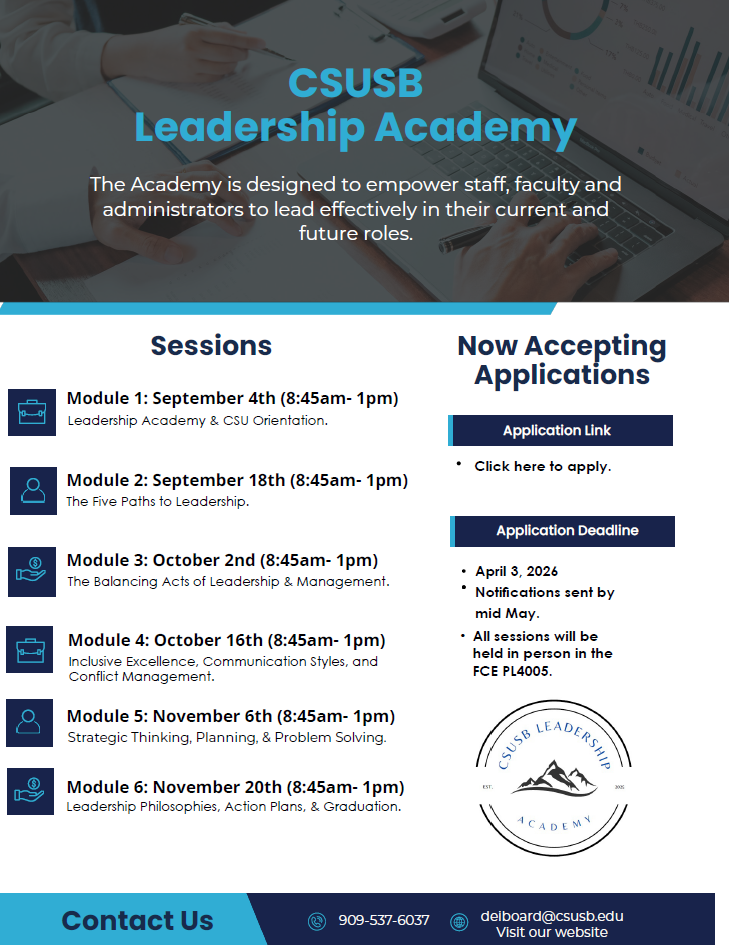 Launched in Fall 2025, the CSUSB Leadership Academy is a professional development initiative designed to cultivate inclusive, effective leadership among staff and faculty across the university. The Academy supports participants in strengthening their leadership capacity for both current and future roles, while fostering collaboration, equity-minded practices, and institutional excellence.