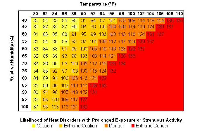 The Heat Index (HI) is the temperature the body feels when heat and humidity are combined. The chart below shows the HI that corresponds to the actual air temperature and relative humidity. This chart is based upon shady, light wind conditions. Exposure to direct sunlight can increase the HI by up to 15°F. This table can be used in consideration of the risk factors and the subsequent need for water, rest and shade. Regardless of the actual ambient temperature, provision of water and shade as described above should be implemented whenever the Heat Index exceeds 90°F. See attachment B for guidance on monitoring the weather.