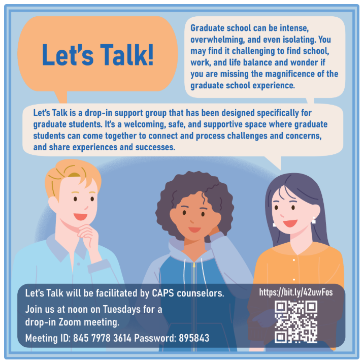 Let’s Talk is a drop-in support group that has been designed specifically for graduate students.  It is a welcoming, safe, and supportive space where graduate students can come together to connect, vent, process challenges and concerns, and share experiences and successes.
