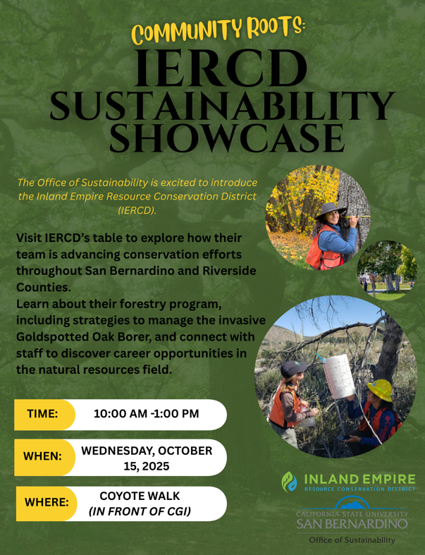 Visit IERCD's table to explore how their team is advancing conservation efforts throughout San Bernardino and Riverside Counties. Learn about their forestry program, including strategies to manage the invasive Goldspotted Oak Borer, and connect with staff to discover career opportunities in the natural resources field.