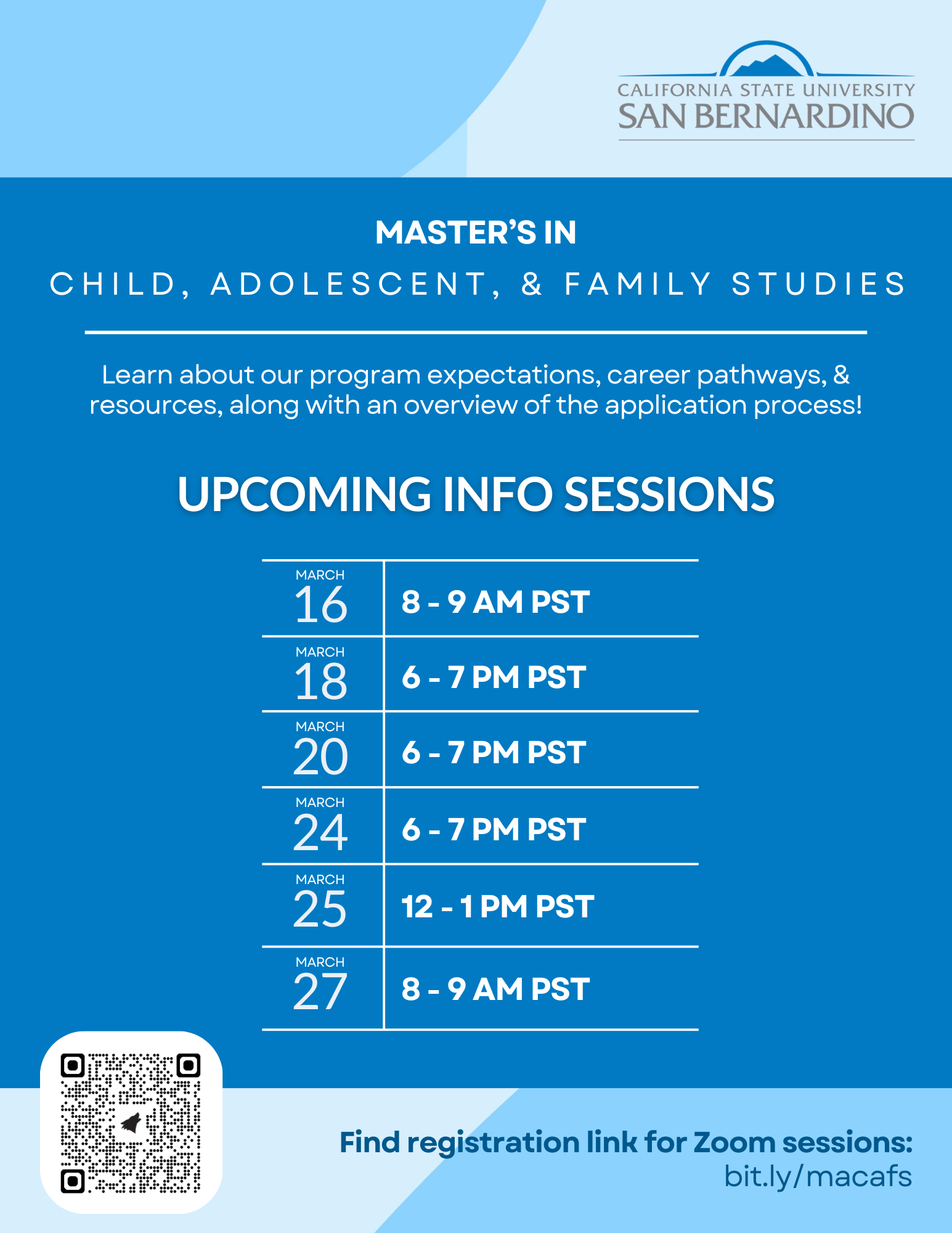 Come learn about the Master's program in Child, Adolescent, & Family Studies! The info session will describe our program expectations, career pathways, resources for our graduate students, and an overview of the application process. Join us to learn more & ask any questions you have!