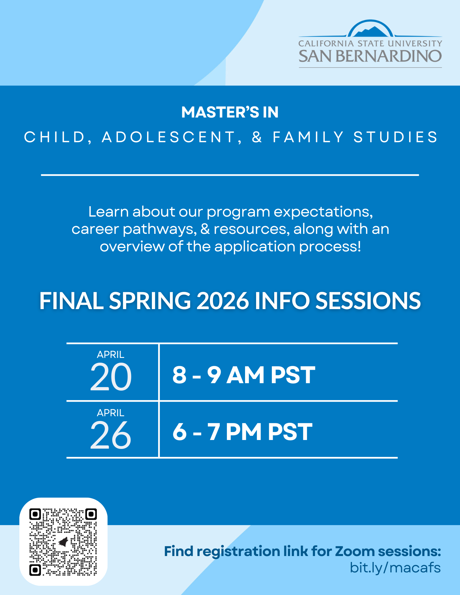 Come learn about the Master's program in Child, Adolescent, & Family Studies! The info session will describe our program expectations, career pathways, resources for our graduate students, and an overview of the application process. Join us to learn more & ask any questions you have!