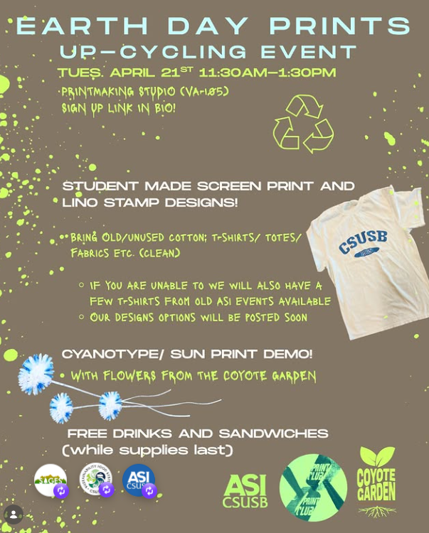 Join the Printing Club, ASI, and Coyote Garden for a creative printmaking event featuring student-made screen prints and linocut stamp designs. Participants are encouraged to bring old or unused (clean) cotton T-shirts, tote bags, or fabric items to customize and transform. If you don’t have anything to bring, a limited selection of T-shirts from past ASI events will be available.