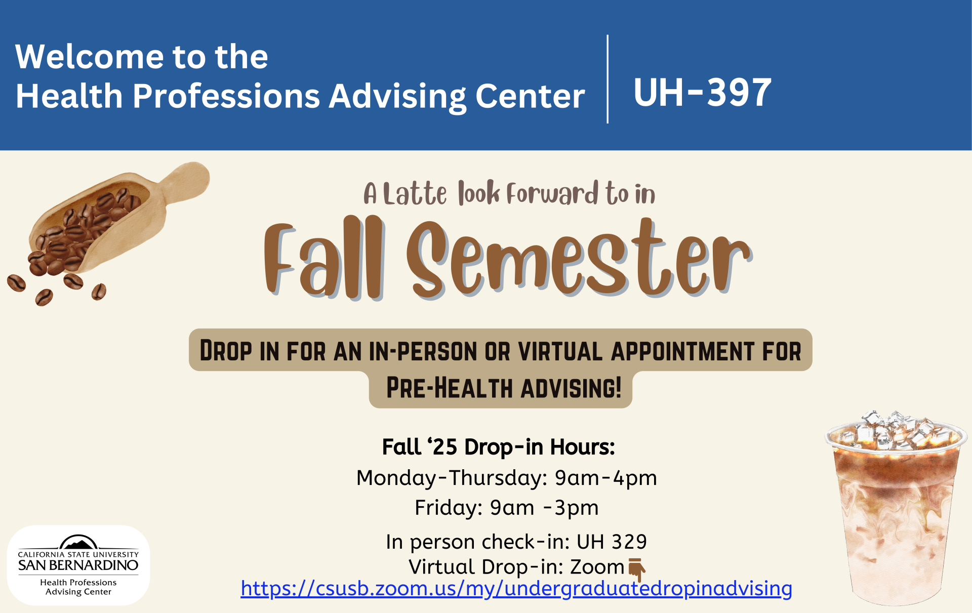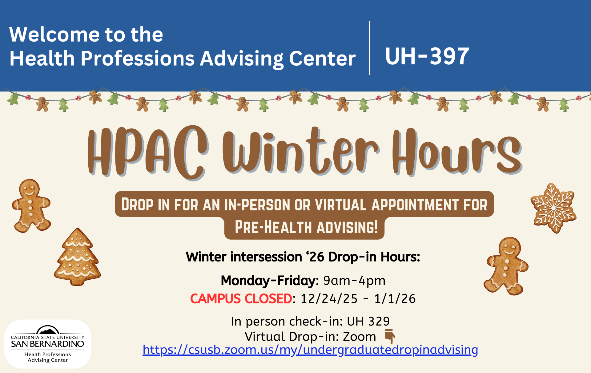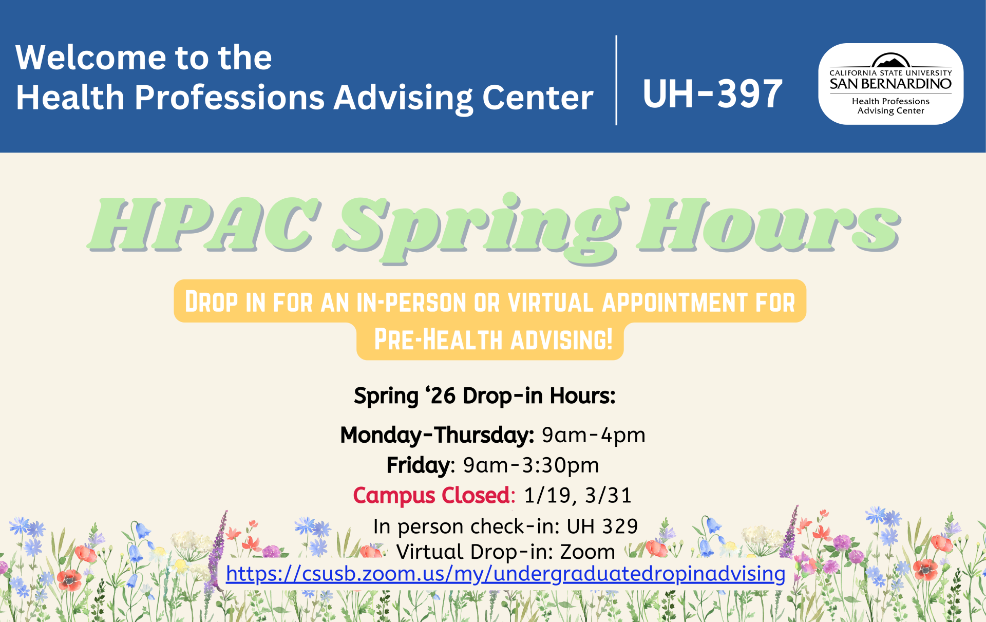 The Health Professions Advising Center (HPAC) provides students and alumni strengths-based advising, resources, and support for those seeking careers in the health professions. HPAC is staffed with a dedicated professional and pre-health peer advisors committed to supporting CSUSB’s diverse study body in attaining their academic and professional goals.