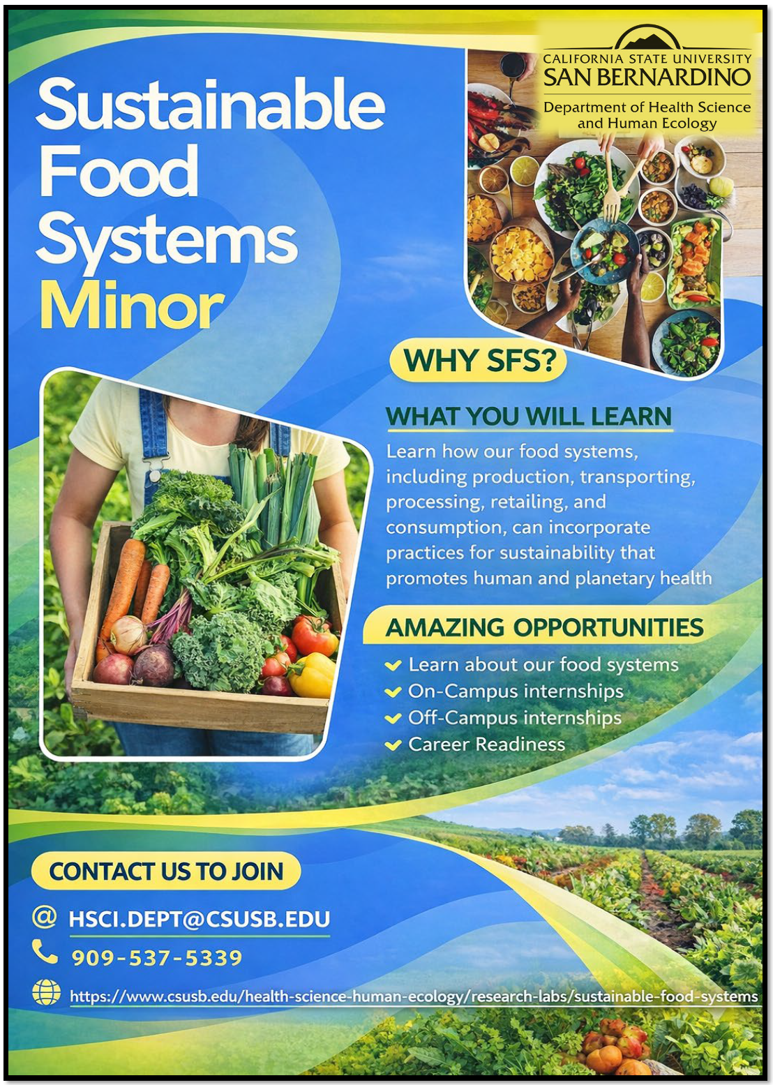Requirements for a Minor in Sustainable Food Systems CSUSB Courses Course Name HSCI 3671 Sustainable Food Systems (3) HSCI 3679 Experiential Learning in Food Systems (3) HSCI 4675 Sustainable Food Systems Seminar (1)