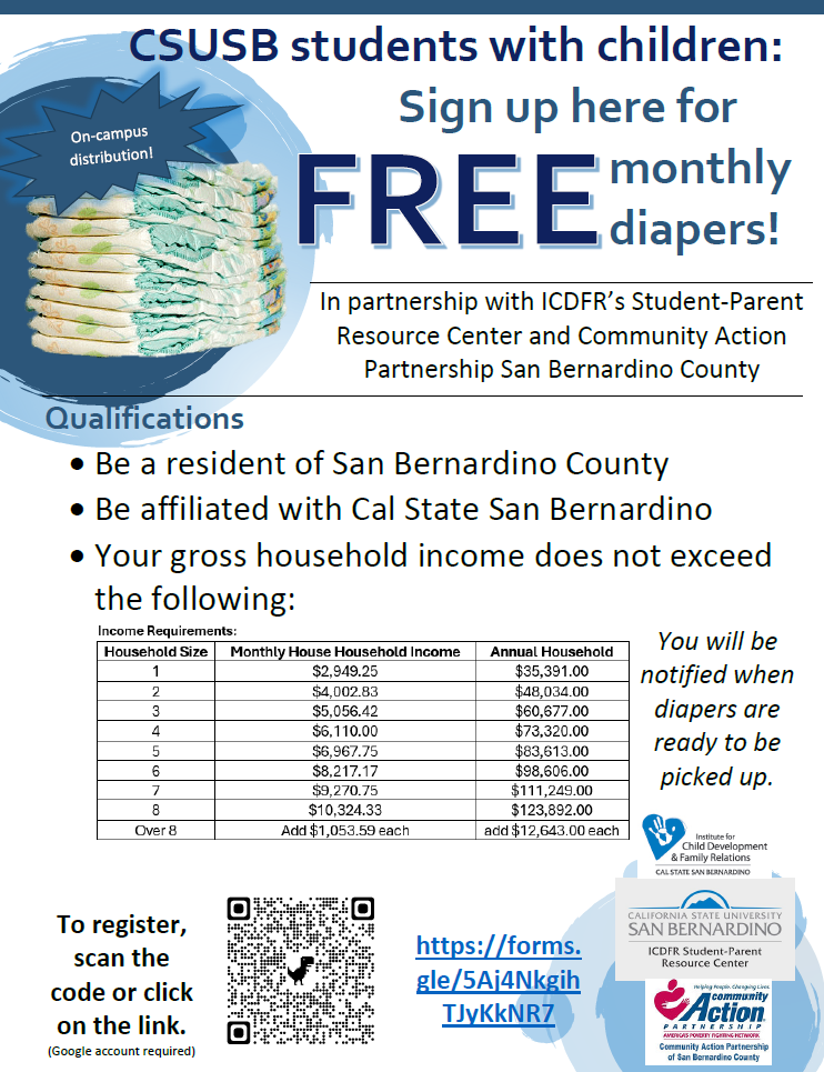 CSUSB student-parents who live in San Bernardino County are eligible to receive two packs of diapers per month (50 diapers total) at no cost. Register here: https://docs.google.com/forms/d/e/1FAIpQLSd2oWNF4cKH206g9g6hw_dbkmptrPRJDH-A1UwWBb6eE3HGLw/viewform