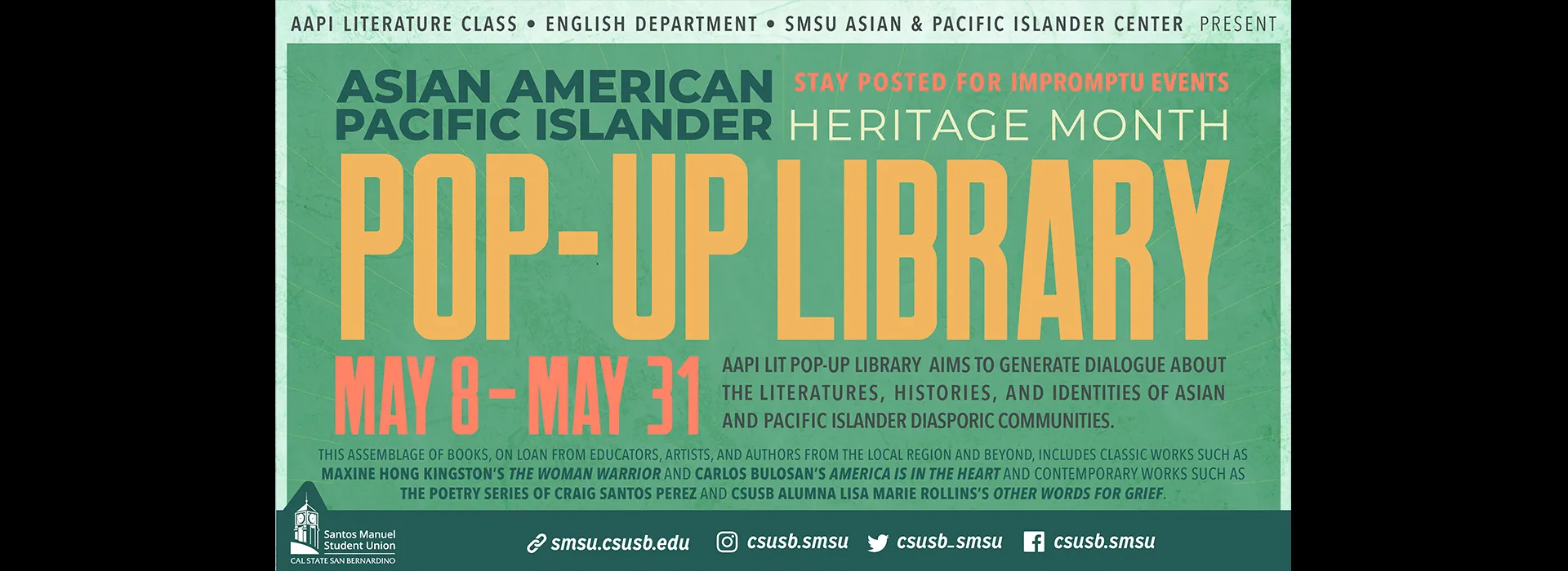 Celebrate Asian American Pacific Islander Heritage Month through May 31, and stop by the Asian American Pacific Islander Lit Pop-Up Library in the Asian & Pacific Islander Center on the second floor of the of the Santos Manuel Student Union.