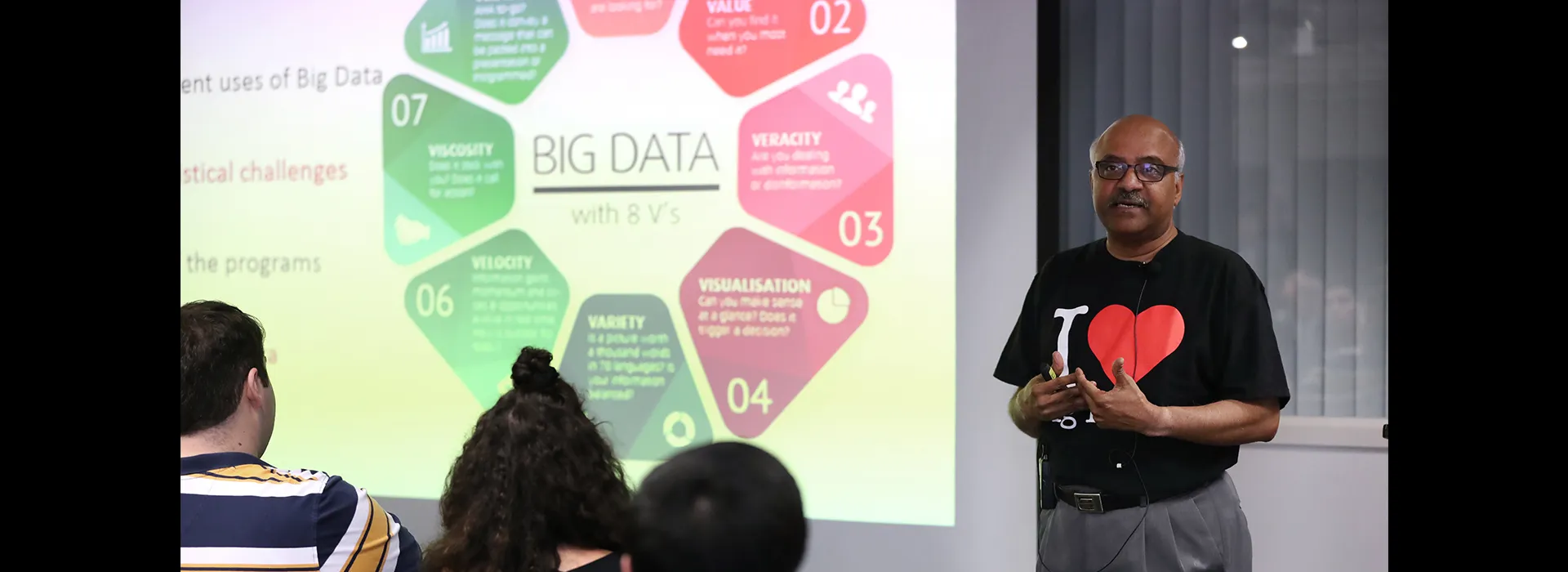 Big Data, huge volumes of data that cannot be processed with traditional databases and software techniques, is changing the dynamics of many industries and occupations including science, education, business, law enforcement and health care, and that is affecting the job market, said Sastry G. Pantula, dean of the Cal State San Bernardino College of Natural Sciences. The hottest jobs in the country include genetic counseling, mathematicians and data scientists because they involve mathematics and data, said Pantula during his talk, “Big Data and Promises,” held at the John M. Pfau Library Multimedia center on April 16. “Nerds are on top of the boards right now,” Pantula said to the nearly filled room of more than 80 students, faculty and staff. Pantula, who joined CSUSB last July to lead the college, is a nationally and internationally recognized as a leader in statistical sciences. Converting data to useful knowledge and information requires a team effort from mathematicians, statisticians, computer scientists and domain experts. Equally important, it also provides career opportunities for students, he said. Originally, there were a few aspects to consider about Big Data: massive volumes of both structured and unstructured data that is so huge it is difficult to process using traditional database and software techniques; volume, the amount of data; variety, the type of data; and velocity as every second there is new data. But there are now additional aspects such as data visualization, the value of data – the cost and profit, the validity and veracity of data, and the various uses of Big Data, Pantula said. Those uses include DNA sequencing, astrophysics and, most recently, Big Data was involved in the image of a black hole that was unveiled last week. It took eight telescopes around the world a week of observations to produce the black hole image, but it took scientists much longer to teach those instruments to work together, according to a story from Space.com. Nevertheless, the use of Big Data should be used carefully and responsibly, he said. “Treat data like people. It can be very useful and very hurtful,” he said. Facts should be facts and not alternative facts, which could ruin the credibility of information gleaned from Big Data. “If you lose that trust, it’s hard to build it back,” Pantula said. Big data is changing the way in which key industries operate, leading to new levels of efficiency and progress. In the health care field, for example, big data is enhancing patient care by helping to diagnose diseases in their earliest stages, when treatment is usually most effective – and often less costly. In some cases, computers are already outperforming doctors While big data has broad-ranging potential for improving humanity’s condition, concerns exist about privacy and the security of large amounts of data, such as personal medical records – one the most sensitive types of information collected. To protect privacy and secure information, experts caution, robust safeguards must be built into data-storing systems. Most recently, Pantula served as director of data analytics programs at Oregon State University (OSU). He also served as dean of the College of Science at OSU from August 2013 to August 2017, after a three-year term as director for the Division of Mathematical Sciences at the National Science Foundation. Pantula spent more than 30 years as a statistics professor at North Carolina State University (NCSU), where he began his academic career in 1982. At NCSU, he also served as director of graduate programs (1994-2002) and head of the department of statistics (2002-2010). He is a Fellow of the American Association for the Advancement of Science and the American Statistical Association (ASA). He served as ASA president in 2010 and received the ASA Founders Award in 2014. Pantula is a member of the honor societies Phi Kappa Phi, Sigma Xi, and Mu Sigma Rho. He is also a member of the NCSU Academy of Outstanding Teachers. Pantula received both bachelor’s and master’s degrees in statistics from the Indian Statistical Institute in Kolkata, India, and a Ph.D. in statistics from Iowa State University. For more information on Cal State San Bernardino, contact the university’s Office of Strategic Communication at (909) 537-5007 and visit inside.csusb.edu.