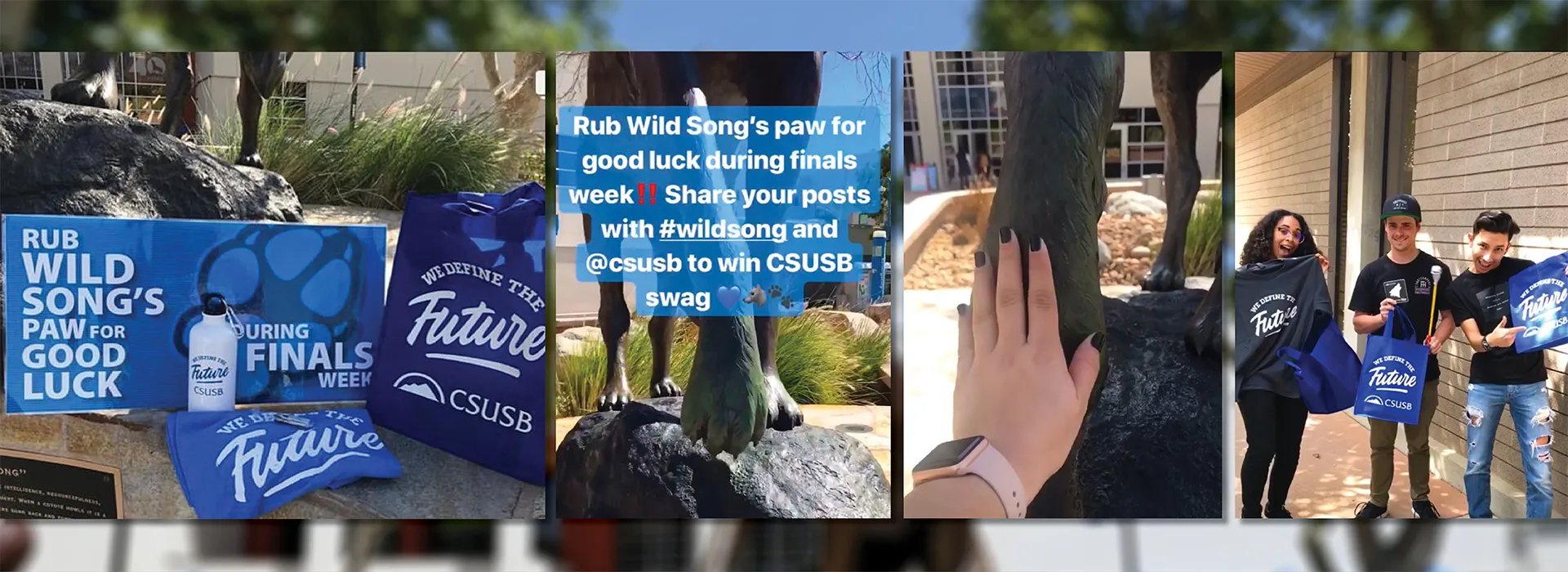 Photos by Rebekah Waddell/CSUSB Office of Strategic Communication Wild Song, the bronze sculpture of a coyote at the west entrance of the Santos Manuel Student Union, is getting a lot of attention these days. That’s because it’s finals week for the winter quarter at Cal State San Bernardino, and that means heading over to Wild Song to rub its paw for good luck during exams. On social media: Tag us at @CSUSBNews (Twitter) and @CSUSB (Instagram), and join the #CSUSB tradition of rubbing the paw of #WildSong for good luck during finals. #WeDefineTheFuture