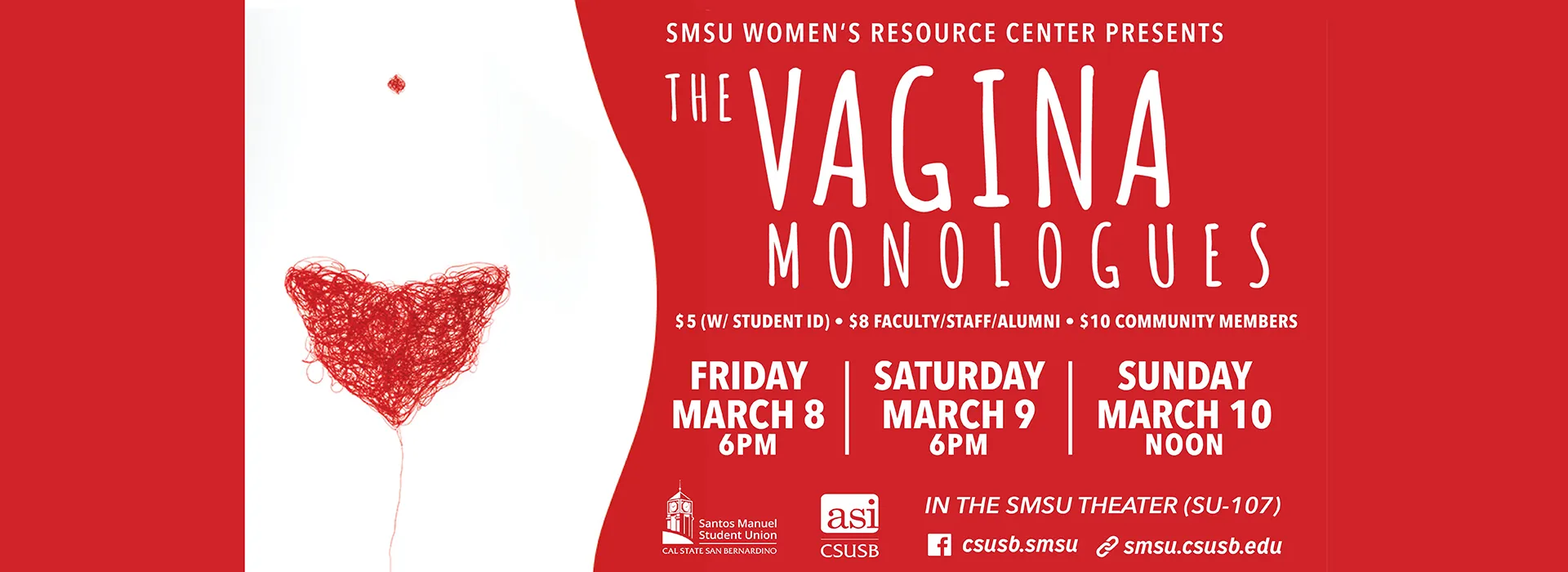 The award-winning play, “The Vagina Monologues,” will be performed at Cal State San Bernardino on Friday, March 8, Saturday, March 9, and Sunday, March 10, at the university’s Santos Manuel Student Union Theater. The Friday and Saturday performances will be from 6-9 p.m. and Sunday’s performance will be from noon to 2 p.m. Proceeds will benefit the Option House in San Bernardino, an organization that helps victims of domestic violence. Tickets prices are $5 for all students (with student ID), $8 for faculty, staff and alumni, and $10 for all others. Parking on campus is $6. The performance is open to the public. The monologues are recommended for mature audiences. The play, based on Eve Ensler’s award-winning stage show, will be portrayed by CSUSB students, faculty, staff and alumni, who auditioned and were selected for the readings. It will feature some of the candid, funny, painful and yearning insights of women talking about their no-longer-so-private parts. Their experiences are told with compassion, humor, intelligence and honesty that will entertain and inspire the audience. For more information about “The Vagina Monologues,” contact the Women’s Resource Center at (909) 537-7203 or email heather.carrasco@csusb.edu.