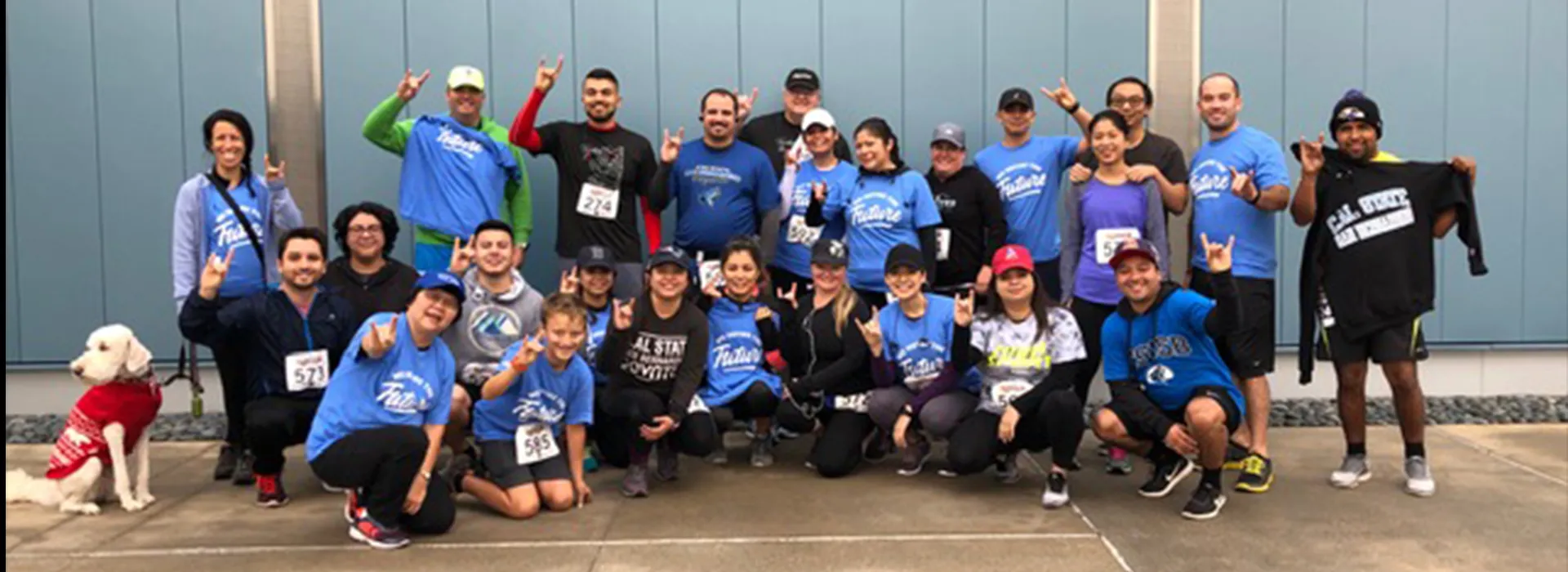 Nearly 30 Cal State San Bernardino affiliates, who were each given a “We Define the Future” T-shirt, participated in the fourth annual Turkey Trot hosted by the city of San Bernardino’s Community Emergency Response Team. The event, which took place on Thanksgiving morning, featured a variety of routes, including a 10K, 5K, Family-Fun Run, and Kiddy Walk. “A big thanks to Jake Orta (legislative assistant in the CSUSB Office of Government and Community Relations) who organized the university’s involvement and who ran the 5K himself,” said Pamela Langford, director for executive affairs in the Office of Government and Community Relations. “As always, thanks to President Morales for underwriting the registration costs for members of the CSUSB family. We had a great – and growing! – presence.” Visit the the San Bernardino Turkey Trot website to learn more about the event.