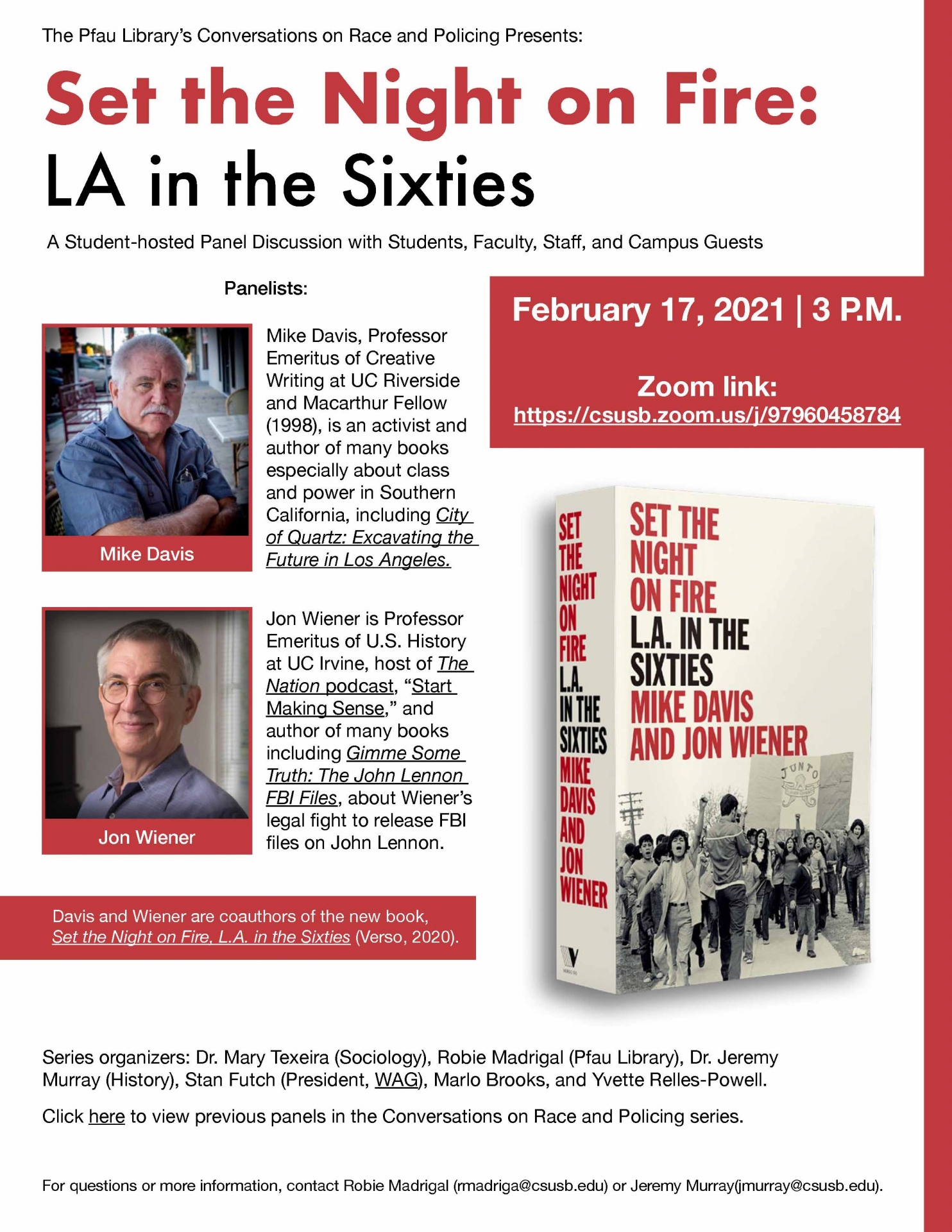 The presentation, “Set the Night on Fire: L.A. in the Sixties,” which takes its title from the book by guest speakers Mike Davis and Jon Wiener, will be livestreamed on Zoom beginning at 3 p.m. Wednesday, Feb. 17, and can be accessed from a PC, Mac, Linux, iOS or Android at https://csusb.zoom.us/j/97960458784.