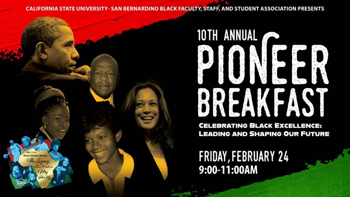 The Black Faculty, Staff and Student Association (BFSSA) at Cal State San Bernardino will host the 10th annual Pioneer Breakfast on Friday, Feb. 24, celebrating the accomplishments of individuals who have made an impact at CSUSB.