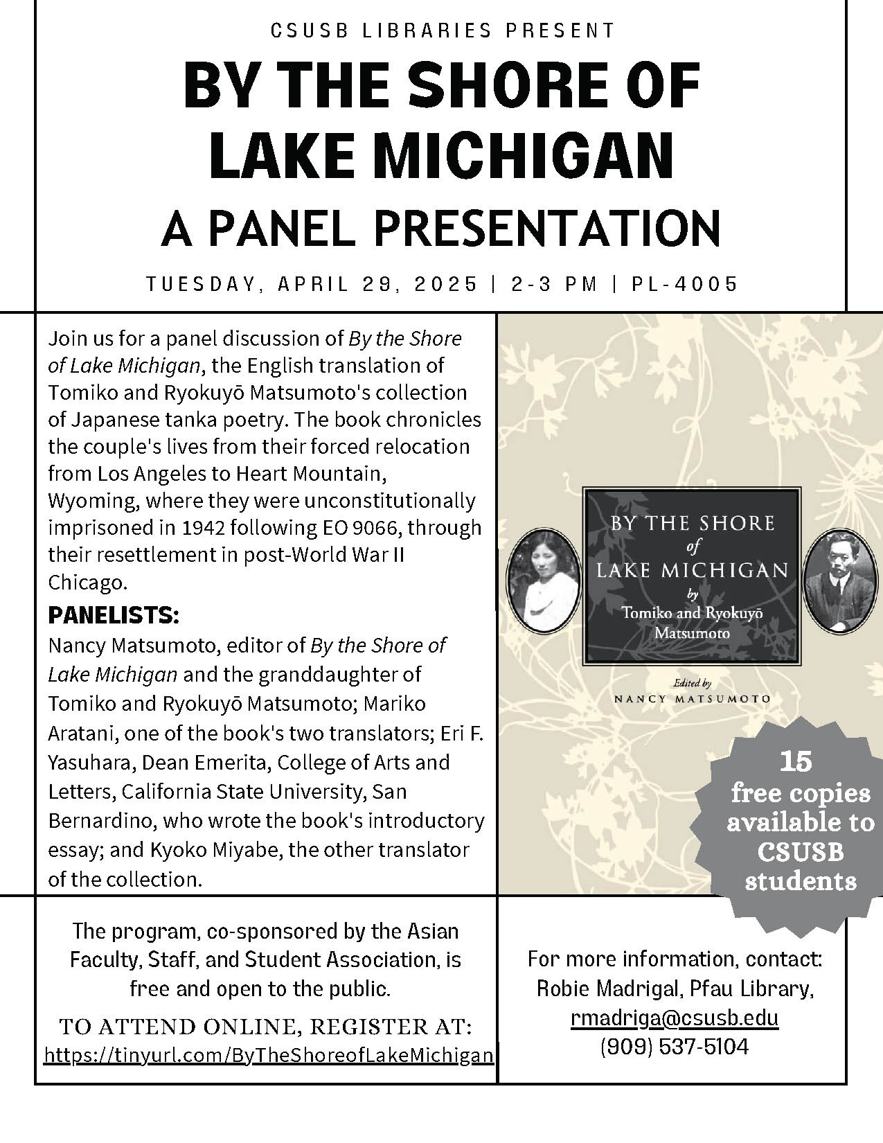 The CSUSB Libraries program, “By the Shore of Lake Michigan,” which takes its name from a book of poems by Tomiko and Ryokuyō Matsumoto, will take place in the John M. Pfau Library, room PL-4005. Free copies of the book will be available to the first 15 CSUSB students who attend in person.