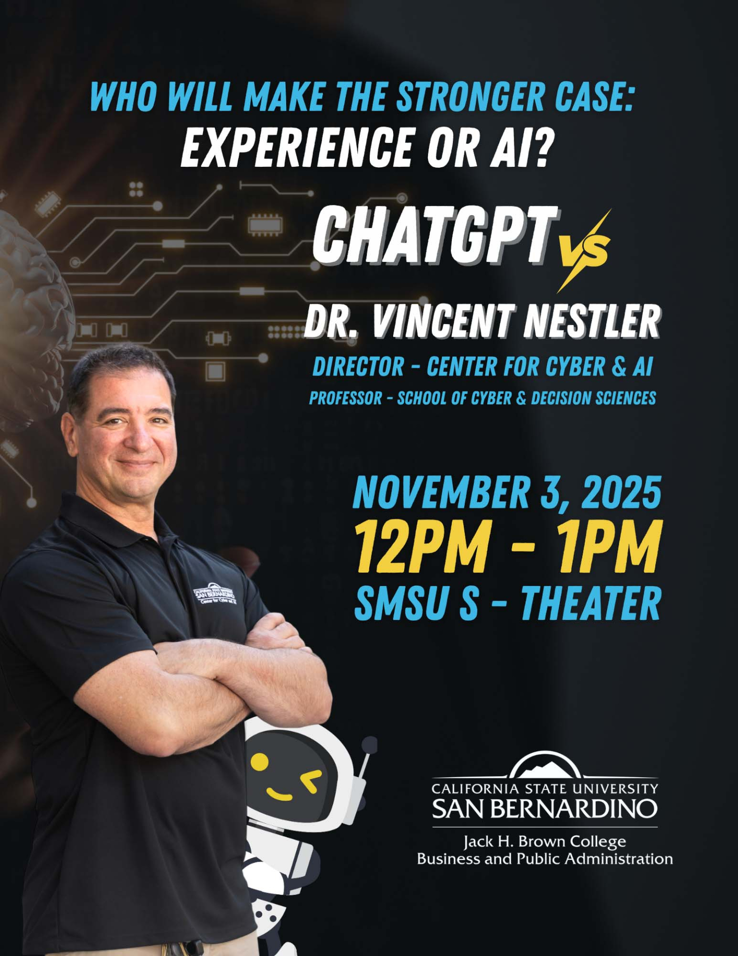 Cal State San Bernardino’s Jack H. Brown College of Business and Public Administration will host a lively and thought-provoking event, “The AI Debate: ChatGPT vs. Dr. Vincent Nestler,” on Monday, Nov. 3, at noon in the Santos Manuel Student Union (SMSU) South Theater.