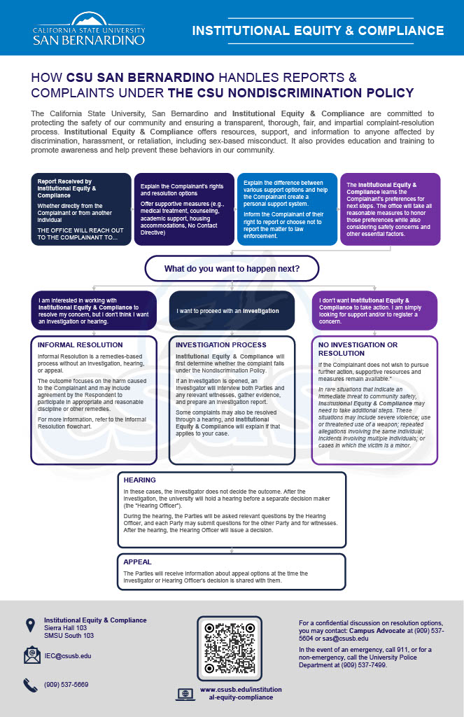 The California State University, San Bernardino and Institutional Equity & Compliance are committed to protecting the safety of our community and ensuring a transparent, thorough, fair, and impartial complaint-resolution process. Institutional Equity & Compliance offers resources, support, and information to anyone affected by discrimination, harassment, or retaliation, including sex-based misconduct. It also provides education and training to promote awareness and help prevent these behaviors in our community.