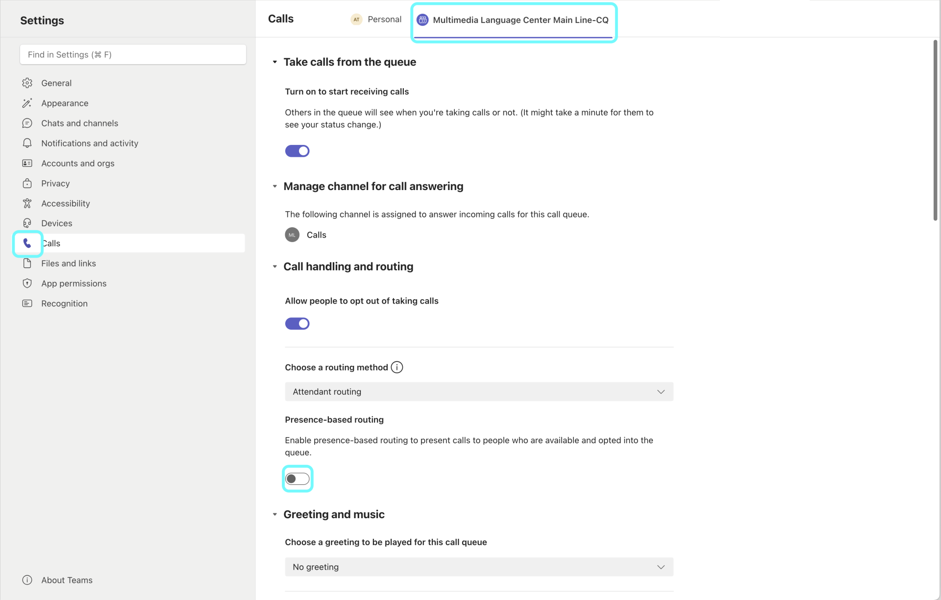 Supervisors/owners can turn off Presence-Based Routing so that the calls to the main line/call center ring regardless of an agent's status in Teams.