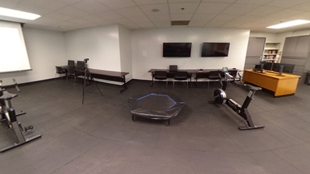 This is the motor behavior lab, which is a dedicated space for classes and research related to motor learning and control as well as motor development and sport psychology. This lab is housed with an advanced eye tracking system, virtual simulation bikes, and video editing techniques. It also has an open space for movement activities.