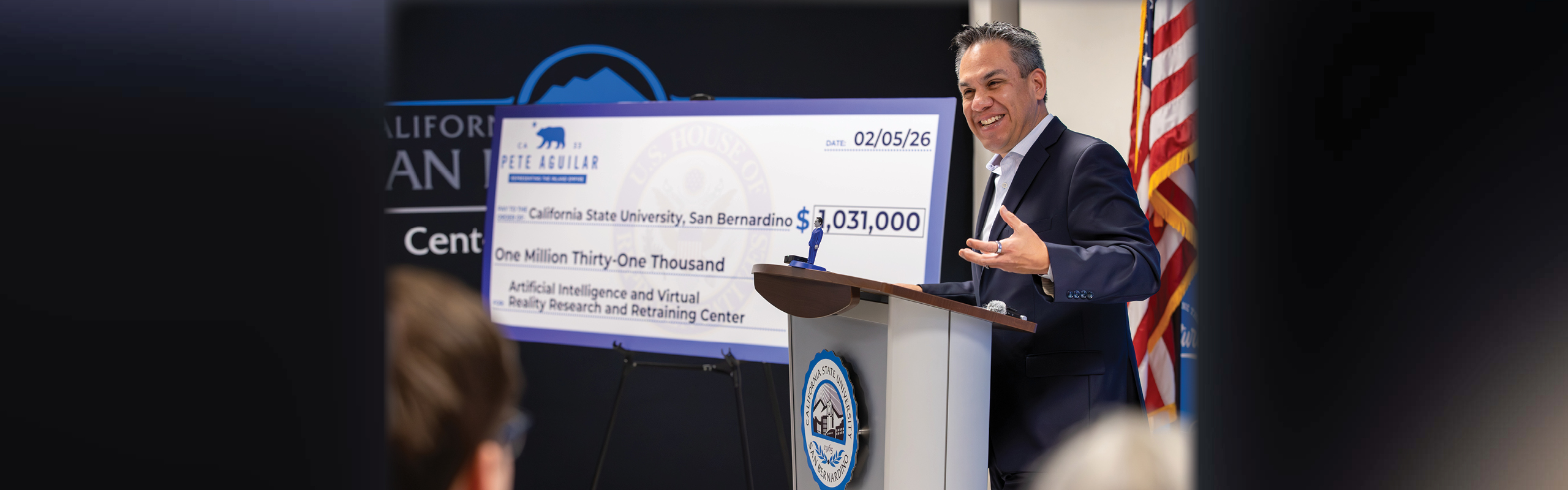 “This will strengthen AI technology in our workforce and provide all of you students with opportunities for retraining and training and growth in the VR and AI technology space,” said U.S. Rep. Pete Aguilar, as he formally announced the grant award at CSUSB’s Center for Cyber and AI.