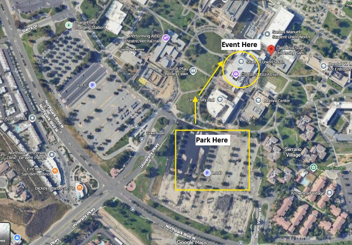 Driving instructions - Make sure to put "CSUSB Lot D" into apple/google maps.