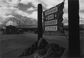 Wooden sign at entrance to the Manzanar War Relocation Center with a car at the gatehouse in the background. / Photograph by Ansel Adams.