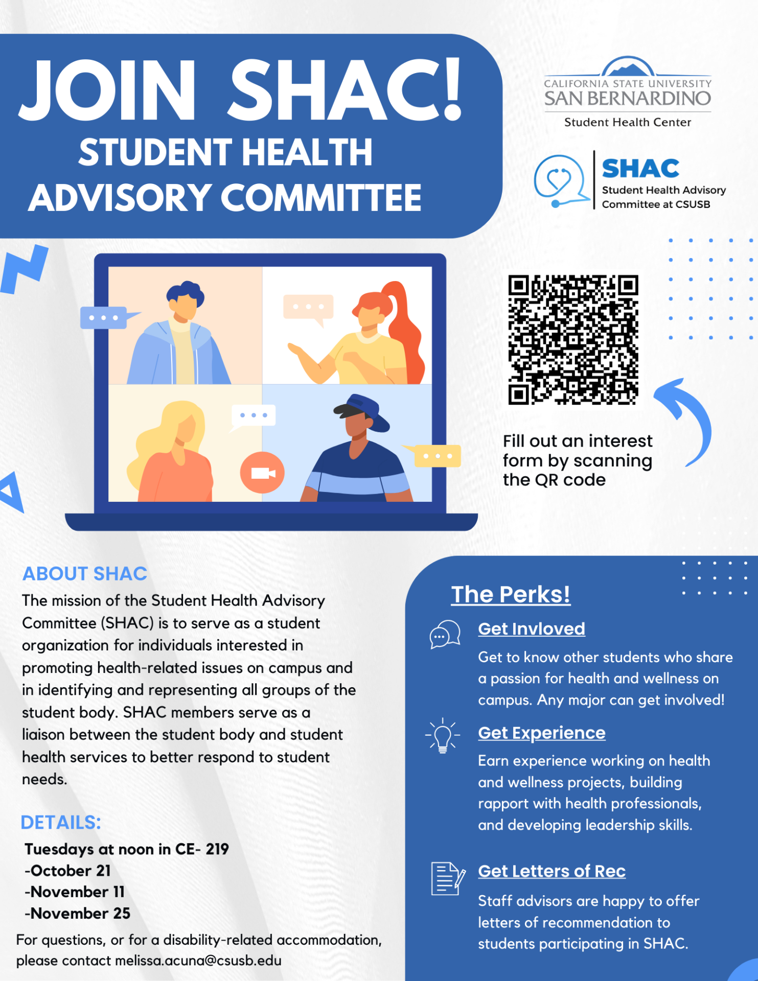 We welcome students on an ongoing basis. Submit an interest form to get started. For more information about SHAC, please get in touch with Melissa Acuna, Senior Health Educator, at melissa.acuna@csusb.edu or 909-537-3655.