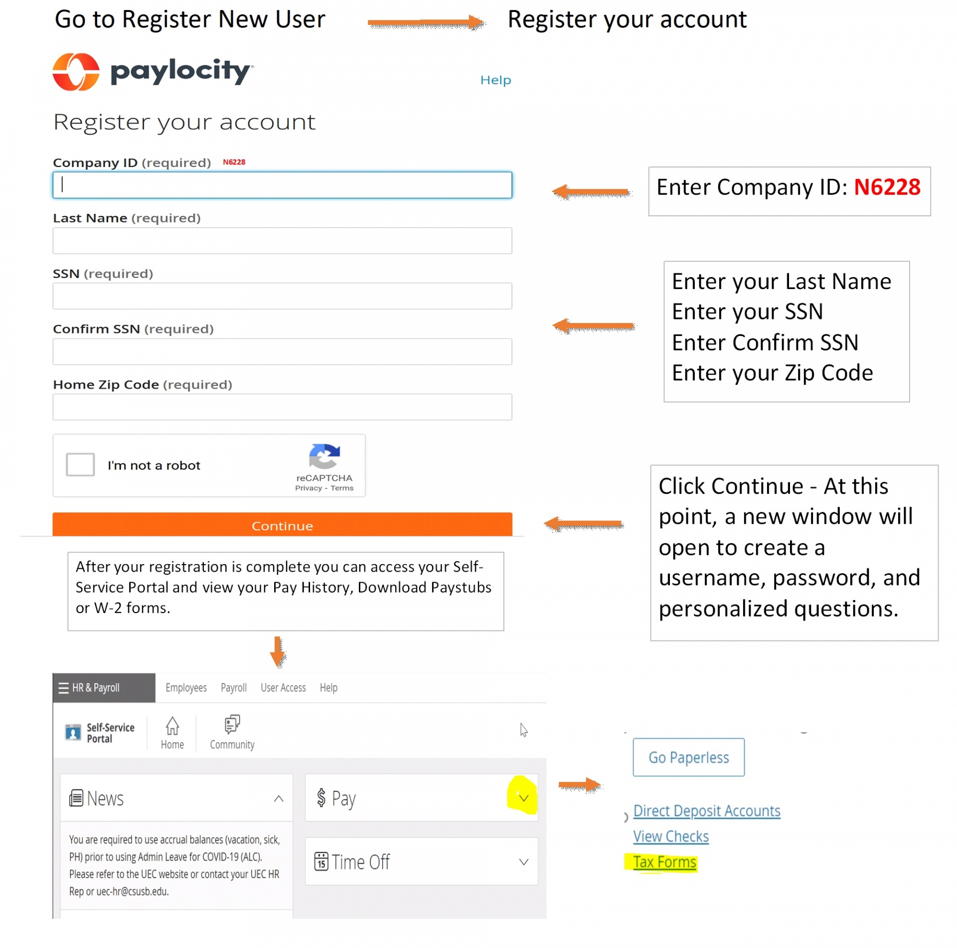 Register your user account at Paylocity. UEC employees use company ID N6228. Once you register with Paylocity you will be able to view your check stubs, tax forms, and have the option to set up direct deposit.